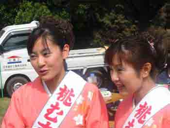 桃むすめのおふたり、どちらがミスでどちらかが準なのでしょうね。 公園内で写真サービス、酔っ払いから子供まで人気がありました。 |