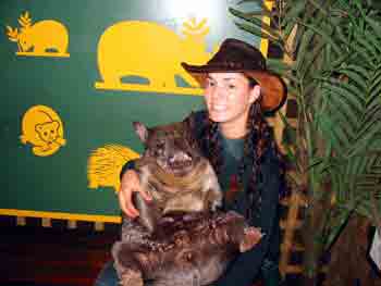 | ウオンバットの赤ちゃん。 抱いているのは案内のお姉さん。個人経営の動物園で抱いて写真を撮らせてくれました。 とてもおとなしくずっしりと重かったですね。 これはメスでおちんちんのように見えるのは尻尾。 |