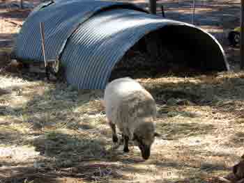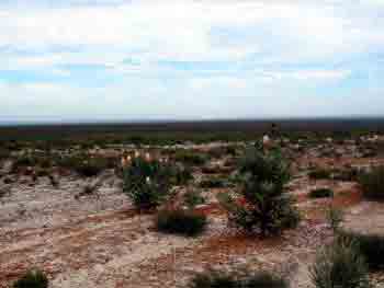 牧場以外はこんな低木の荒野、野生のカンガルーが道路に急に飛び出してきます。 車にはカンガルーよけのパイプのバンパーがついていました。 |