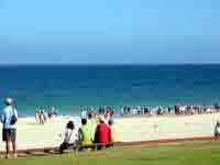 ![]() 街の近くの海岸で小学生のミニトライアスロンが開かれており、大勢で応援をしていました。 左は役員の可愛いお姉さん。 |