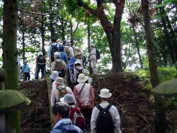 | 最初に訪れたのは高尾神社古墳です。裏側に古道があります。 この古墳前を明治時代には東北本線が走っていたそうですが鬼怒川の鉄橋が何度も流され現在の線路に変更したのだそうです。 |