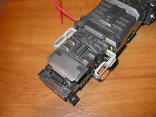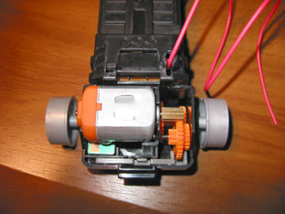 駆動モーター取り付け 手前のギアが左右にスライドすることに 対応するために、モーターピニオンの 長さが長かったことがわかります。 |