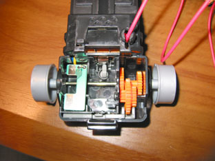 リアホイール駆動系 (モーター取り付け前) 手前のギアが左右にスライドすることにより 変速比を2段階に変えます。 |