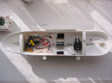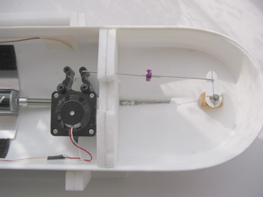 スチロールの板で、前後に2箇所の隔壁を作ってあります ラダーのアクチュエータはこの後部隔壁に取り付けてあります。 (これより後ろは、後部甲板の作業船を載せるために 船体内部が圧迫されていて、取り付けられませんでした。) |