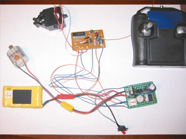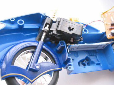 さすがに二輪のフォルムを崩さないように、 ステアリングアクチュエーターや回路基板はコンパクトに 作られています。 ただし、二輪なので、バック走行は出来ません 送信機のスティックを手前に引くと、電磁ブレーキがかかる しくみになっています。 |