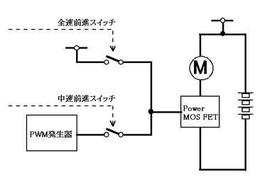 モーターコントロール回路は、怪しいものを作ってしまいました 元の回路基板の電磁ブレーキ動作は不要でしたので、 そのときに中間速度の前進を実現しました |