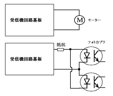 話が少し横道にそれますが、 前進、後進出来るラジコンの受信機回路基板の モーター駆動信号線を使って、フォトカプラを駆動する場合 この配線が合っています。 |