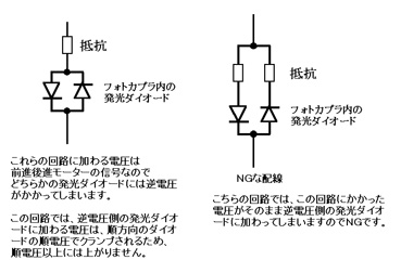 発光ダイオードは整流用ダイオードとは異なり 逆電圧に非常に弱いものです。 スペックシートを読むと、逆電圧は5V程度であると 記載があります。 左図の2つの回路は似ていますが、 左の回路が正しく、右の回路ではフォトカプラの 発光ダイオードを壊してしまう可能性があります。 |
