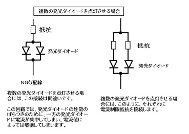 ちなみに、見た目は似た感じの回路ですが 複数の発光ダイオードを点灯させる場合には それぞれの発光ダイオードに抵抗を接続します。 抵抗を1本にまとめた左の回路は間違いです。 |