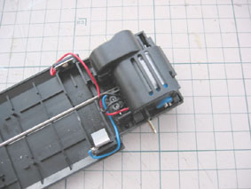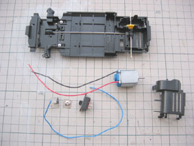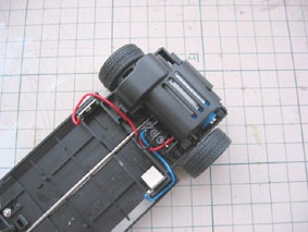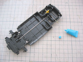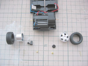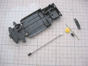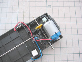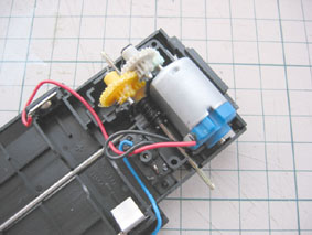 後輪は、右輪だけに駆動力が伝わる仕組みです 左輪はフリー回転するようになっています 少し古い模型工作の雑誌では常套手段です。 旋回半径を小さくするための工夫です 旋回速度の左右の差は感じられませんでした。 |