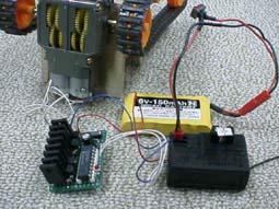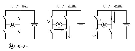 | パワー制御段について 片側ベルト(キャタピラ)のモーター駆動を、 4つのスイッチとモーターと電池で表現します 左の図は、4つのスイッチがオフでモータ停止 真中の図は、2つのスイッチがオンでモーター正回転 右の図は、反対側のスイッチ2つがオンでモーター逆回転 |