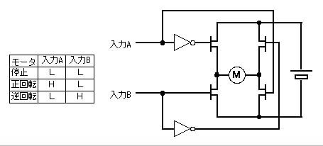 | 上記スイッチを半導体に置き換えます スイッチ素子はパワーMOSFET (入力A,Bを両方とも同時にHにしては いけません。 電源がショートして 回路を焼いてしまいます。) |