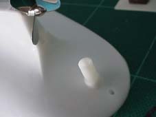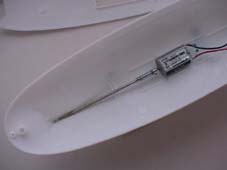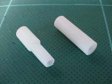 | 舵のさやの部分は 固定用の穴しかありませんでした 可動する舵のシャフトを通すために 電子パーツ店で売られている ポリエステルの基板スペーサーを 加工して取り付けました |