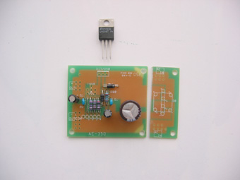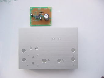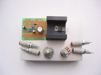 上の画像 このプリント基板はトランスからAC入力を考慮されていて ダイオードブリッジを載せる場所が用意されています。 今回は7.2Vニッカドパックや定電圧電源などの直流電圧を 入力に使いますので使わない部分を切り落としました。 左の画像 一部組み立てたプリント基板、ケース、端子、 ロータリースイッチ、1kΩ可変抵抗器、放熱板です 入出力差電圧値と電流値の積は熱エネルギーに なりますので放熱板が必要になります さらにあとで空冷ファンもつけます |