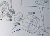 | どうも右リアホイールはガタが多い ようです。 シャフトのナイロンナットを締めこんで デフが効かないほどにするとガタは なくなりますが、ある程度デフが効いた 走りのほうが好きなので、しかたなく ホイールとデフの部品を接着して しまいました。 巻き込み完治では ありませんが、効果がありました。 |