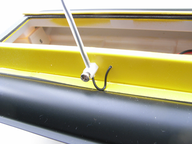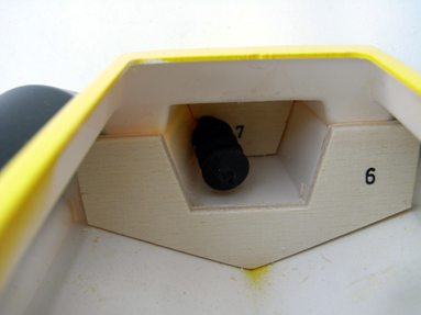 船体の内側から、トランサム部に木製?の補強材を接着します。 ラダーを動かすシャフトを通すための防水ブーツも取り付けます。 |