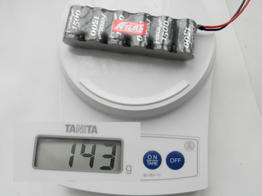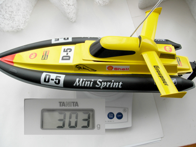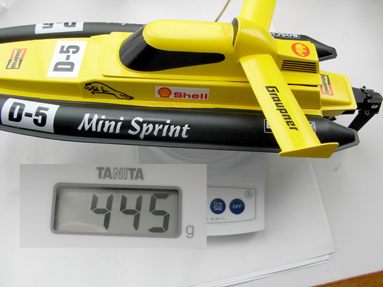 船体のみ 303g 6セルNiMHバッテリー 143g バッテリーを積み走航可能状態 445g |