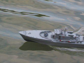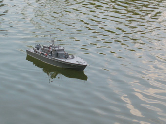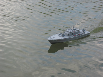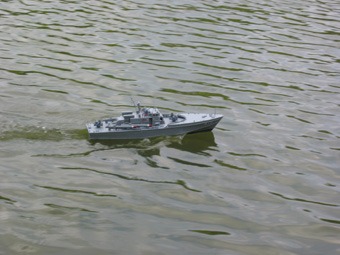実は、前回は、仕事の休みの都合のため、 艤装の済んでいない、製作途中の状態で 走航させてしまいました。 石のタヌキって何? 今回は、艤装工事を済ませて、あらためて走航です。 |