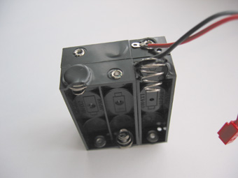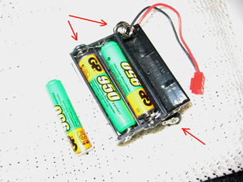 PT−15に、新しく製作して搭載した電池ボックス のトラブルが原因です。 接触バネ箇所の発熱がプラスチックを溶かしてしまい、 電池がはずれて艇内に転がっていました。 よくあるトラブルに電池ボックスのハトメ部分の接触不良が ありますが、そこにはあらかじめハンダ付けをしてあったのです。 しかし電池ボックスのプラスチックの方が溶けてしまいました。 面倒でも、きちんと半田付けして組んだバッテリーパックを 使うべきでした。 |