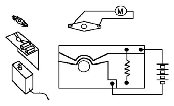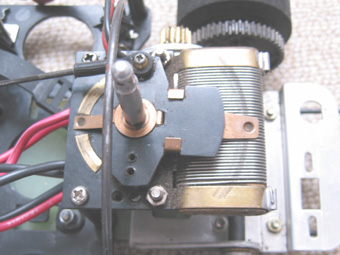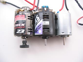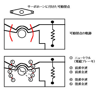 左の図では2段変速ですが、実際には抵抗を2本使った 3段変速を多く作りました。 それと、左の図ではニュートラルでモーター端子がショートし 電磁ブレーキが最大に効いてしまいます。 ここの部分にも抵抗を入れてブレーキの効きを調節していました。 当時は1/20程度の大きさのシャーシに多用しましたが、 540クラスの1/12マシンにも使いました。 (この場合、抵抗の発熱で半田付けが溶けてしまいやすいので 抵抗の固定方法に工夫が必要です。) |