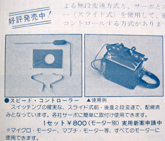思い出のモータースピードコントローラー ABCホビーの1/20ロイヤルシャーシのスピードコントローラー の写真 (左の写真はラジコン技術1978年1月の広告) に衝撃を受けました。 すばらしい設計デザインと感じました。 コンパクトな大きさで確実なコントロールが期待出来そうです 本物は見たことがありませんでしたが、回路は想像できました。 すでに製作当時の現物は残っていません。 エッチング前の生プリント基板を購入し、カッターナイフで溝を掘りました。 抵抗は5Wのセメント抵抗を使いました。アルミ板を曲げた部材で サーボモーターに両面テープ留め。 可動接点は、ブリキの端材からラジオペンチで整形し サーボホーンにビス止めしていました。 サーボホーンの弾性を使って押し付けています |