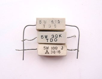 セメント抵抗の思い出 薄暗い中で走らせると、セメント抵抗の中の コイル形状の抵抗体が真っ赤に発熱して、 透けて見えていました。 転倒などの衝撃が何度も加わると、内部抵抗体と セメントの間に隙間が出来始め、しまいには、セメントが 割れてしまいます。 セメント抵抗のスペックを越えた電力を扱っているし、 衝撃も加わっていますので消耗部品でした。 |