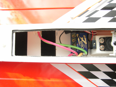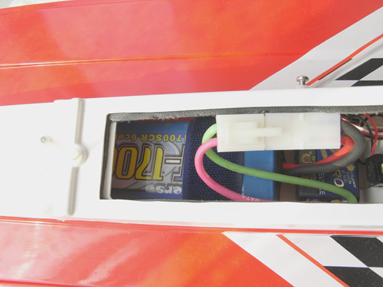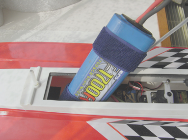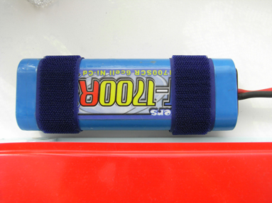 ニッカドバッテリーはいつものようにマジックテープを巻きつけておき、 船内のマジックテープで留めます。 開口部が狭いのでバッテリーは横向きに船内に入れます |