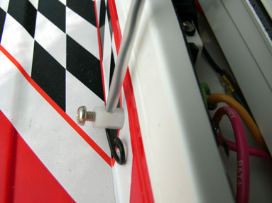 受信機アンテナの取り付け箇所は私のオリジナルです。 電子パーツのネジ切りのあるポリエステルスペーサーを加工して 樹脂パイプを通して固定しています。 この模型の説明書では金属線製のアンテナ(whip aerial)を使用しています。 金属線アンテナの長さ分の受信機アンテナリードを切り取って 船体内部で金属線アンテナに接続することになります。 Cut down the flexible aerial attached to the receiver by about 330mm (length of whip aerial) and connect the bared end to the screw by clamping it between 2 washers. (私は受信機のリードアンテナを切りたくなかったのです。) |