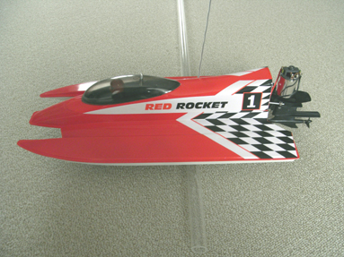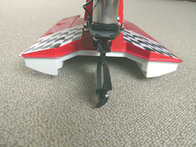 テールから見たところです トンネルタイプの船型です 下はバッテリーを積み走行状態にして アクリルパイプの上に乗せた画像です おおよそこのパイプの位置で前後の重量がつりあいます |