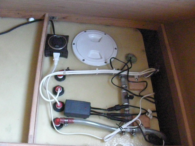 78リッターの清水タンクの排水は、2ndシートを外して栓を抜くようになっていたので、外から排水ができるように変更しています。