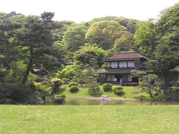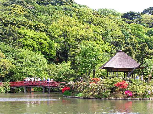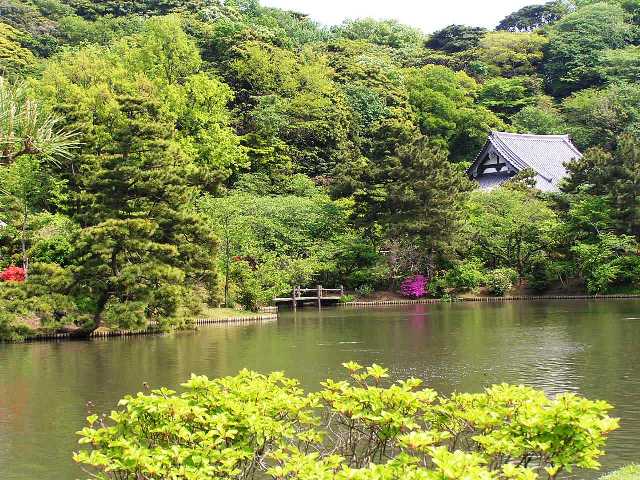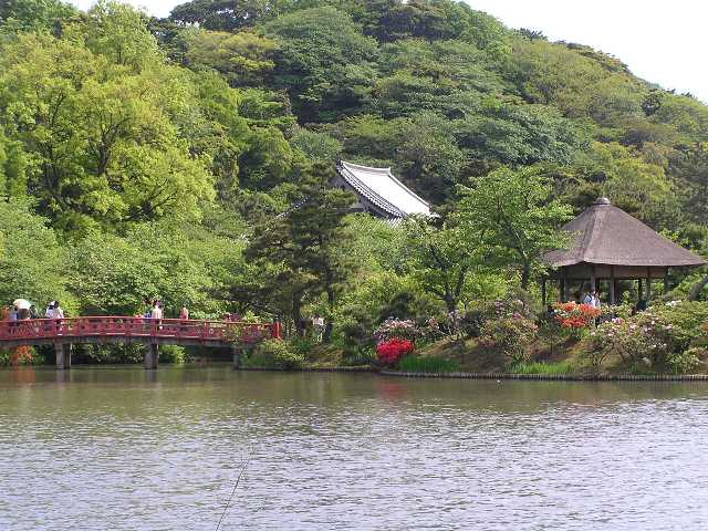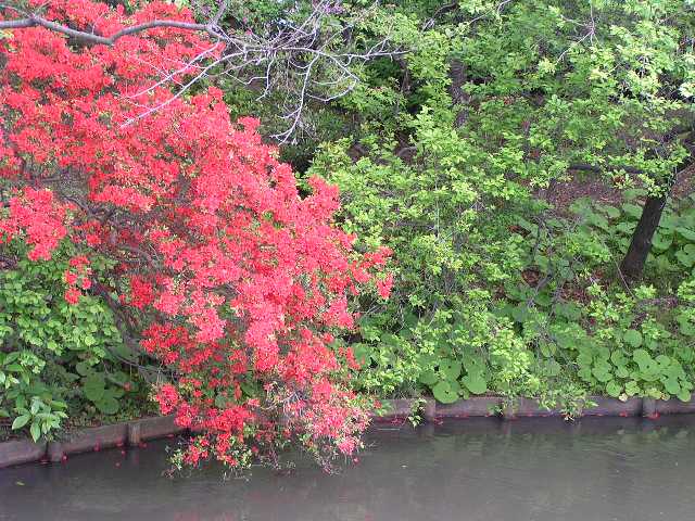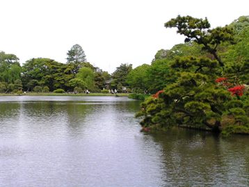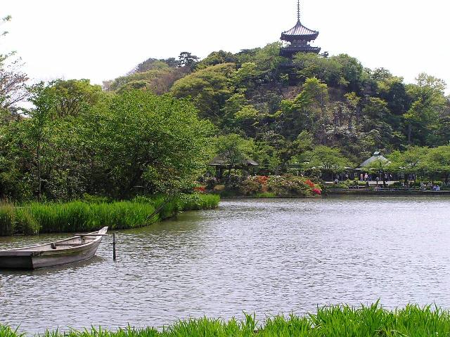 外苑大池と三重の塔は見慣れた景観_____つつじが新緑に彩りを添える