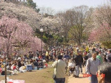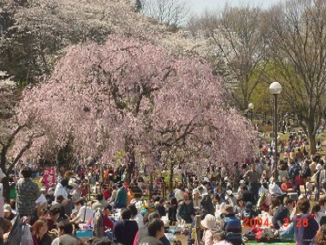 そめい吉野は3〜5分咲き、満開の枝垂桜のもとに人が集まる
