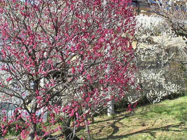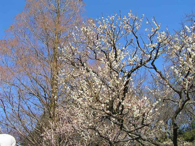 メタセコイヤの落葉樹をバックに___鹿児島紅がバックに白梅