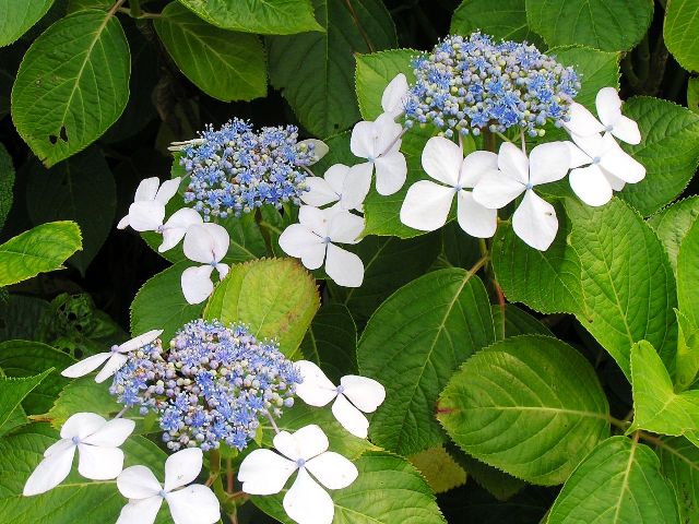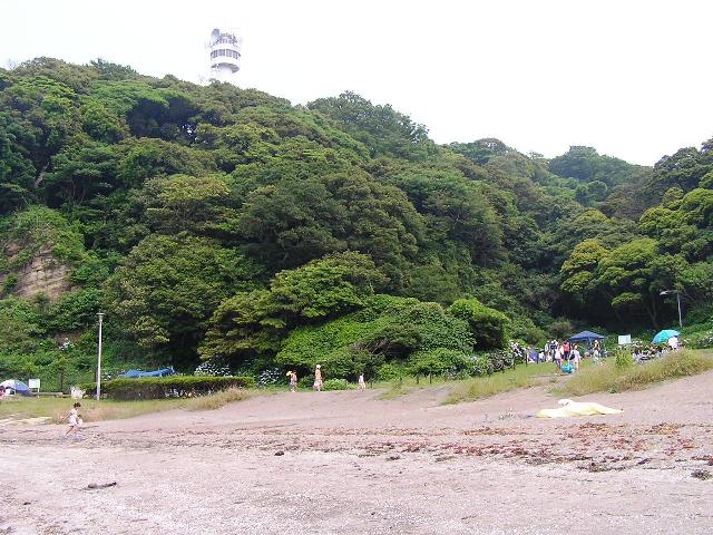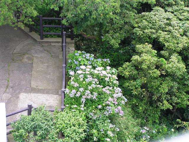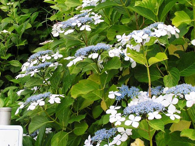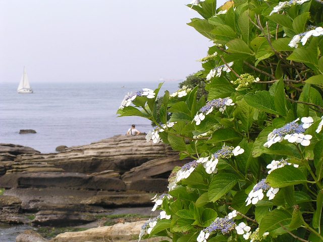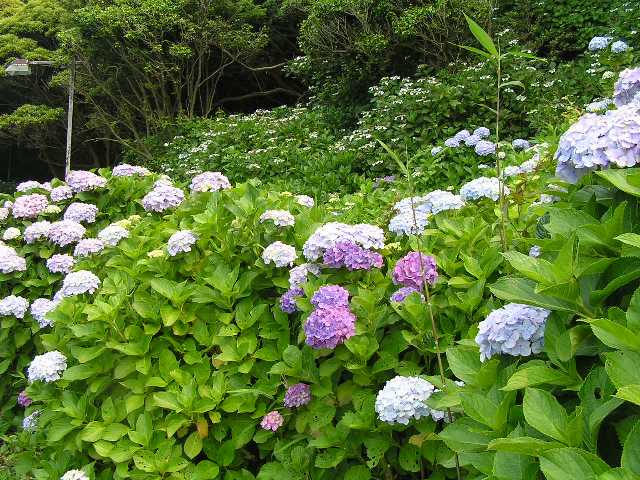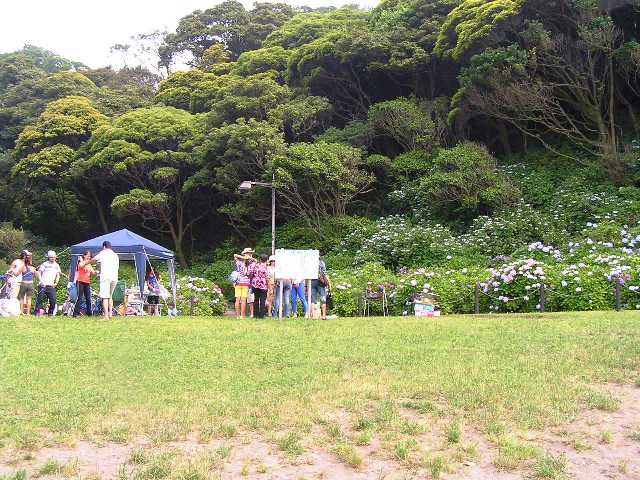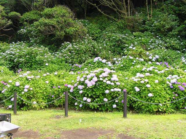 観音崎の浜に紫陽花が一面に咲く_____手前は紫陽花、バックが額紫陽花