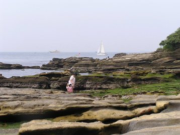 隆起海岸と家族連れ_______ガクアジサイは方々で見られる