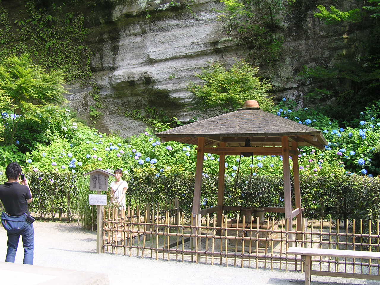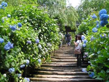 北鎌倉駅裏口(東口)を線路沿いに10分ほど、あじさいシーズンでウィークデーでもすごい観光客