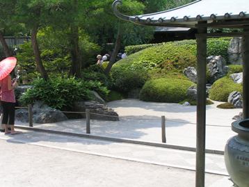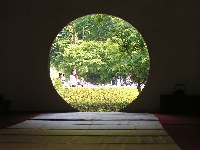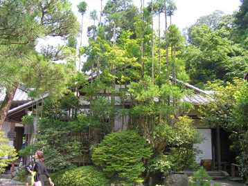 事務所前の北山杉____本堂の窓越しに花菖蒲園が見える