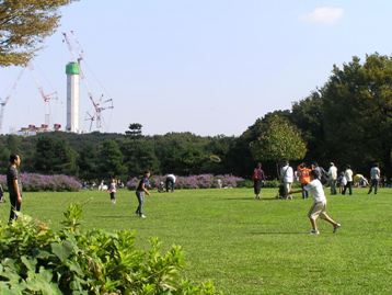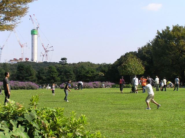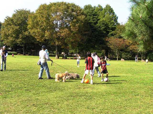 芝生広場ではフリスビーが盛ん_______飼犬の散歩も多い