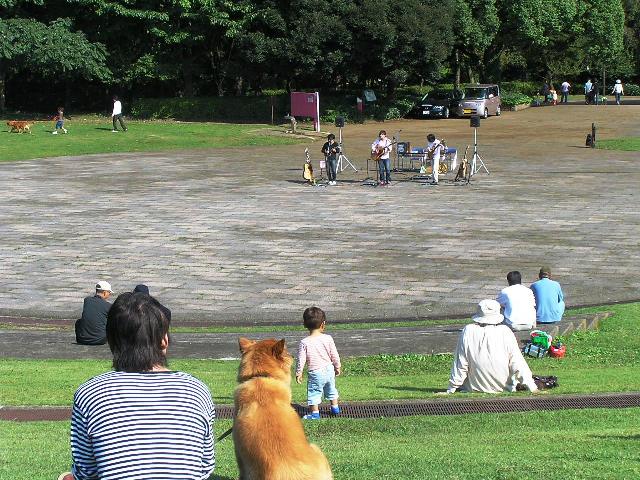 イベント広場では”ひなたごっこ”のバンド演奏__6月にはハナショウブの咲く水無月園”