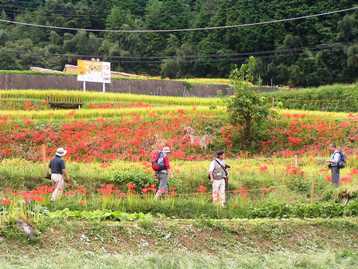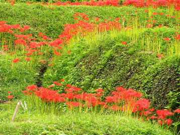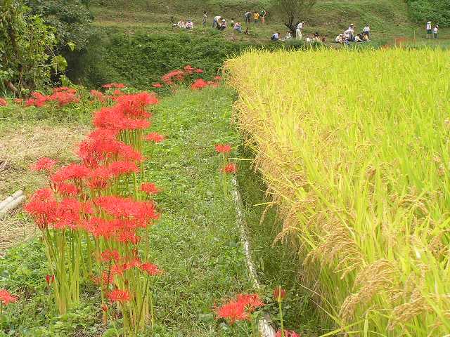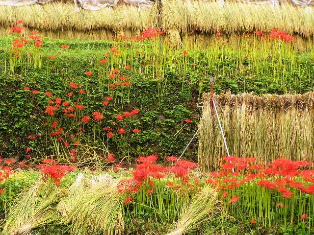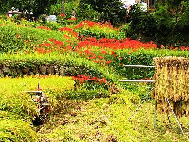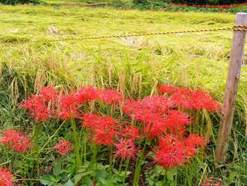 稲刈りと彼岸花、日向薬師周辺