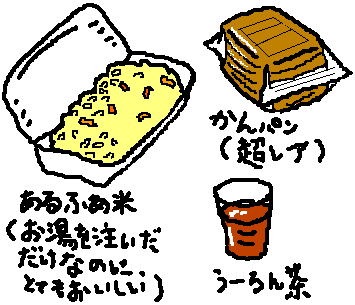ひなんじょのごはんは「あるふぁまい」(たきこみごはんで、とてもおいしい。)、「かんぱん」(おいしい)、「うーろん茶」です。食糧をだいぶかいこんでいきましたが、これならてぶらでいってもぜんぜんごうせいなせいかつができます。ありがとう、とうきょうと。