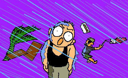 すごいおととかぜです!!しなるやしの木!!べにやいたやうえきばちがびゅうびゅうとんできます!!