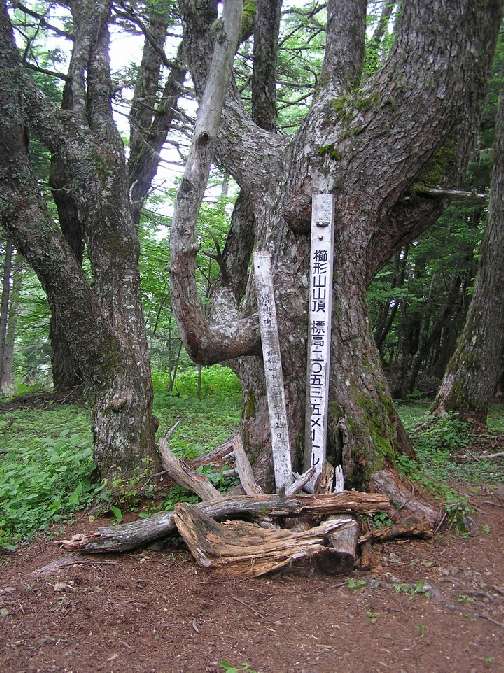 やがて櫛形山頂上。眺望はなく、カラマツの大木が茂っていた。