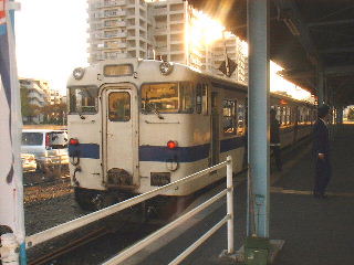 つばめ型の特急電車の夜の間合い利用だが、本州なら、ホームライナーとかいうことにするところ。愛称も、沿線の直方出身の大関魁皇関から取ったと言うから異色ではある。