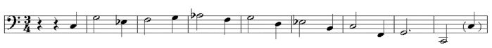 前半の「パッサカリア」では、8小節のパッサカリアの低音主題に対して、20回にわたって8小節の変奏が繰り返されます。パッサカリアの低音主題は、次のものです。