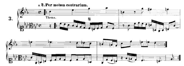 W.上方5度のカノン風フーガ :2声の楽譜ですが、上段は一つの楽譜を2声で兼用し、結果としては3声になります。第1声部が10小節遅れで第2声部の5度上を正確になぞります。5度移すので正確には「カノン」ではない(元の旋律にフラットが1つ増える)ので、「カノン風フーガ」と呼んだのでしょうか。