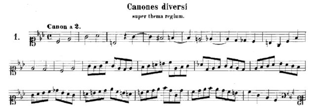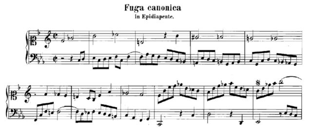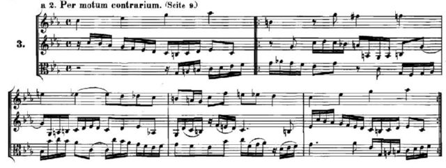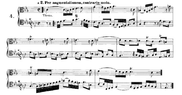 (1)2声のカノン :楽譜は1声のみです。低音声部は上下逆さま(逆行)で。