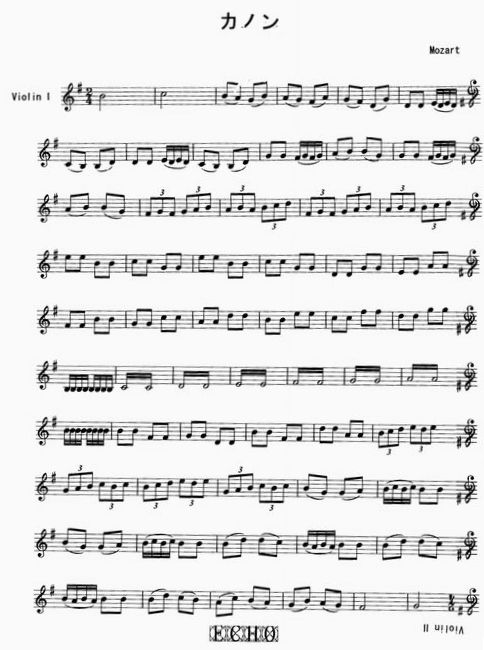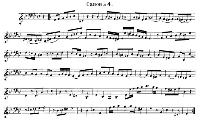 (2)4声のカノン :やはり楽譜は1声のみ。1つの楽譜で4声部の音楽にしてしまう職人技。