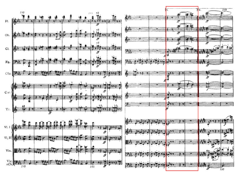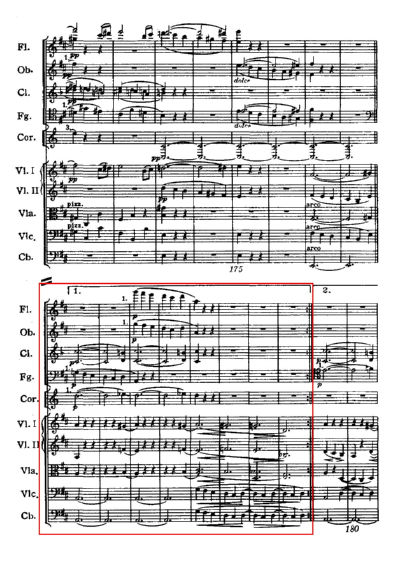 ご承知のように、ドヴォルザークの第8番は、そもそも提示部のリピート記号がありません。一見第1楽章冒頭に戻ったように見せかけて、チェロとホルンの哀愁を帯びた第1主題のあと、フルートの経過句にホルンがハーモニーの第7度の音を加えて、「あれ!違うぞ」ということに気付かせる、ベートヴェンの第9やブラームス第4番に似た仕掛けになっています。意図的にリピートしない構成とした例です。