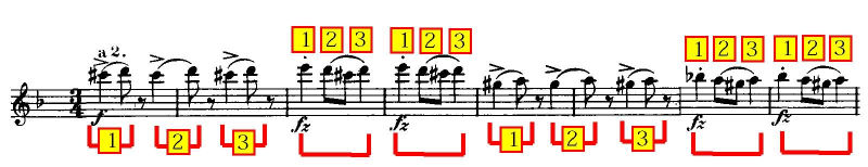 有名な第9番(新世界より)でも、主旋律の裏で半音階的に下降して来る対旋律は「フリアント」のリズムです。このリズムの「表拍」と「裏拍」とが絡み合うので、体にリズムが染み付いていないと空中分解を起こしそうになります。しかも、主旋律自体が頭の音を欠くフェイント戦法で来ますので、なおさらです。(譜例4参照)
